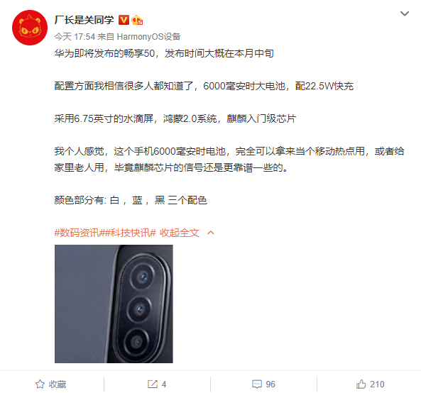 Digital blogger @Factory Director Shi Guan said that Huawei’s new Changxiang 50 will be released in the middle of this month. The phone will be equipped with a certain HiSilicon entry-level chip, with a 6.75-inch water drop screen, built-in 6000mAh battery, and support 22.5W. Fast charging, as well as the Hongmeng 2.0 system, will be available in white, blue, and black colors.